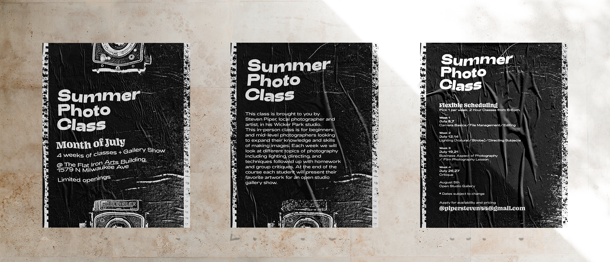After working with Steven for some headshots, I had the opportunity to design flyers for his summer photography class. Taking inspiration from film negatives, and the tactile feeling of the printed form, I created a series of posters to help showcase the information.